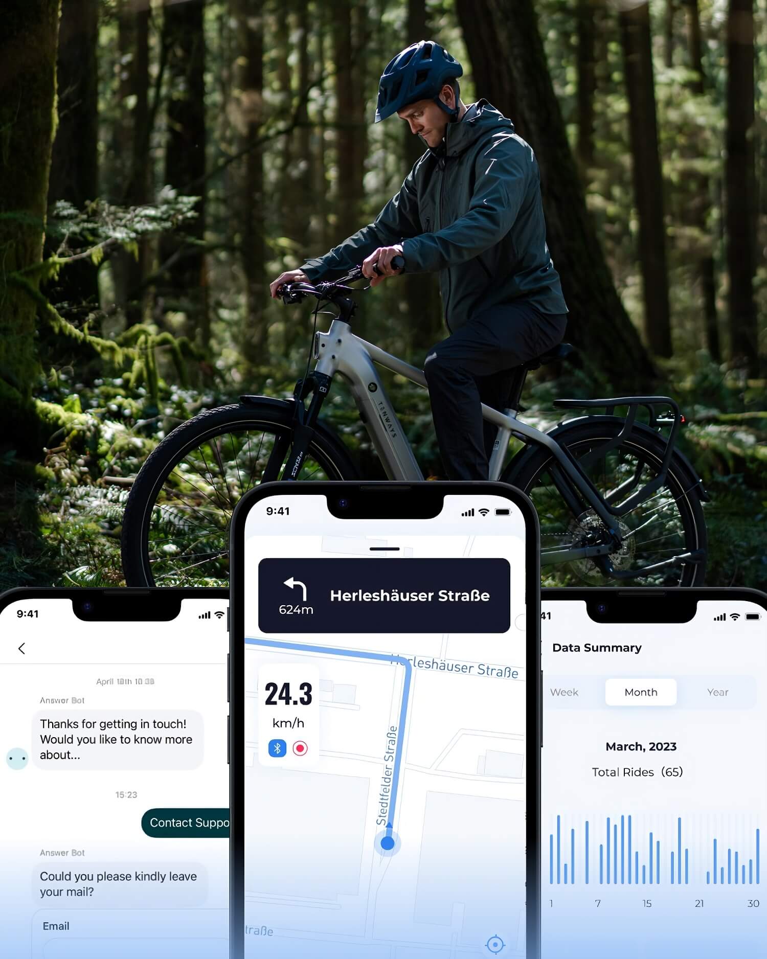 Connect with the TENWAYS App to record your rides in real time and track your stats.